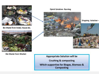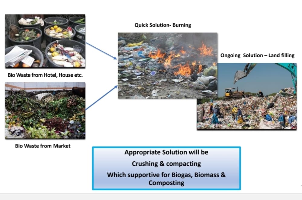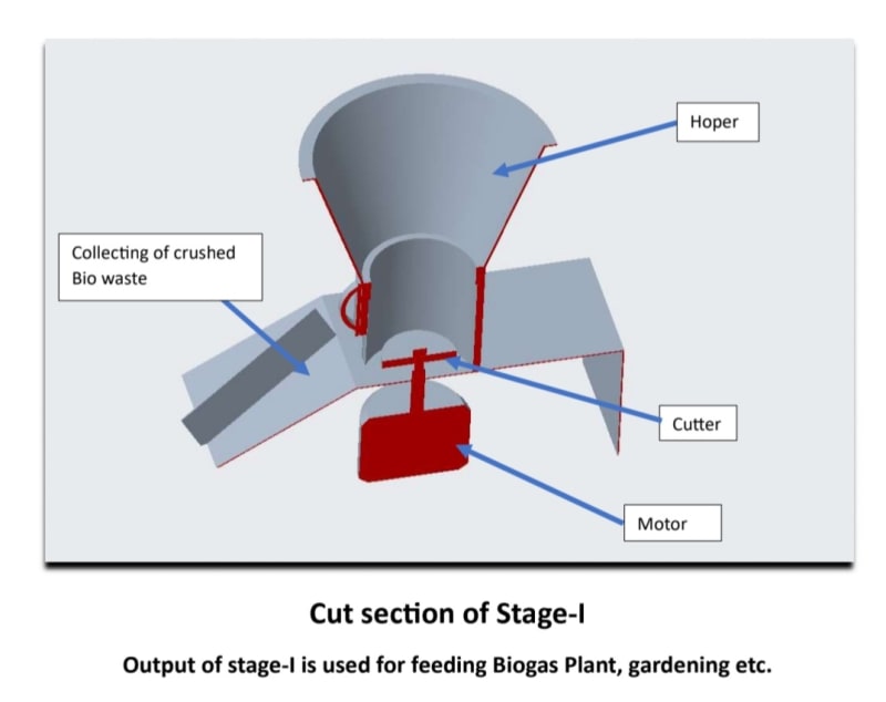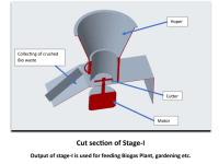 At the waste collection point of market places/under buildings, segregated waste (dry/wet) is directly poured into the hopper of the machine. This waste is crushed using fine cutter for two minutes, converting the bio waste into small particles, like using a blender in a kitchen. The output will be small particles/crushed waste, which may be in a wet state. This output will be valuable for i) Biogas feeding and ii) Earthworm Plants. Consequently, it will be supplied to these plants by small reusable containers.