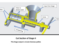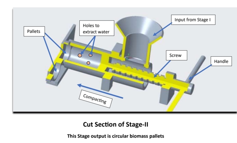 This stage involves pallet making. The output of the first machine is supplied to the second stage by gravity. In this stage, the crushed product is compacted using a screw-type mechanism. Two die pallets are kept in line in this stage, and one is used at a time to develop a pallet after screw activation. Excess water content will be removed by holes in compacting chamber. If needed, wet soil is added as a binder for compacting.