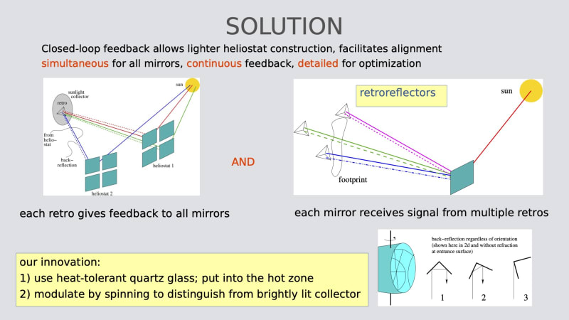 Value proposition: Keeping all heliostats under closed-loop control with seconds-scale reaction times allows a much lighter construction, thus cutting cost. It also allows tighter concentration of sunlight to