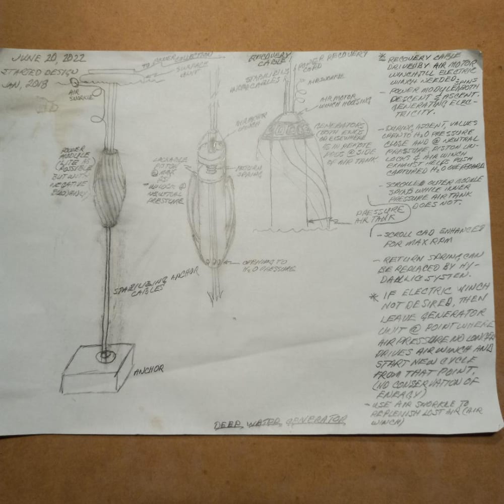 Deep Water Generator: The deep water generator is simply a device to generate electricity (power) as the body of the device sinks in any body of water to depth. The deeper the better.