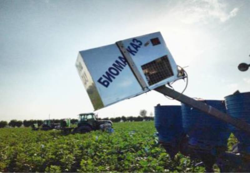 We have created special equipment for the distribution of entomophagola. It attaches to a drone or tractor unit. At the same time, the tractor works between the rows of cotton and distributes beneficial insects with high quality.