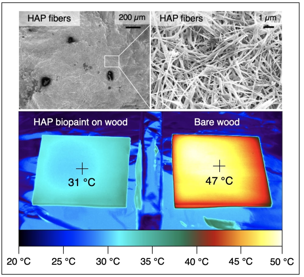 The team is studying low-cost synthesis methods for nanofibrous hydroxyapatite, which reflects 99% of solar radiation and radiates 90% of stored heat through the Earth's atmospheric window. This provides 24-hour cooling without consuming electricity. To enhance applicability, the team is working to disperse this material within paint matrices. This challenge requires balancing cost, durability, environmental benignity, and overall cooling performance. Indications of success have been achieved by combining nHAP with a simple oil paint base. The team has found that HAP can be dispersed within this base with minimal optical performance reduction, which is a ubiquitous challenge in the paint and coatings industry. The unique molecular structure of HAP also forms a novel hardened structure after drying, and the proof-of-concept HAP coating achieves far better cooling than incumbent reflective pigments and paints.