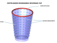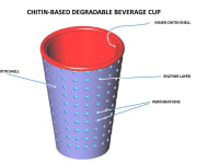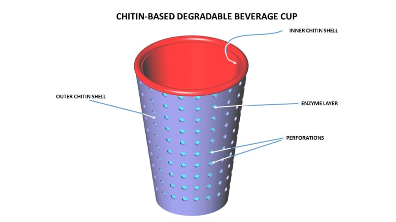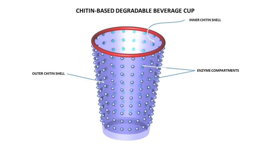 The reactivated enzymes then degrade the chitin of the cup into chitosan, an environmentally-friendly water-soluble compound which has numerous medical (surgical sutures), nutritional (food supplements), industrial (clarifiers, floculants) and agricultural uses (soil amendments).