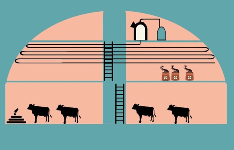 The technology will be implemented in a prefabricated modular frame-type structure with a two-layer coating of greenhouse PVC film, allowing for installation near livestock complexes. Inexpensive construction materials will be used, and the multi-level Bioreactor will be constructed using polypropylene sewer pipes with a diameter of over 200 cm. The size of the production room and the number of modular structures will be determined based on the amount of manure that needs to be processed.