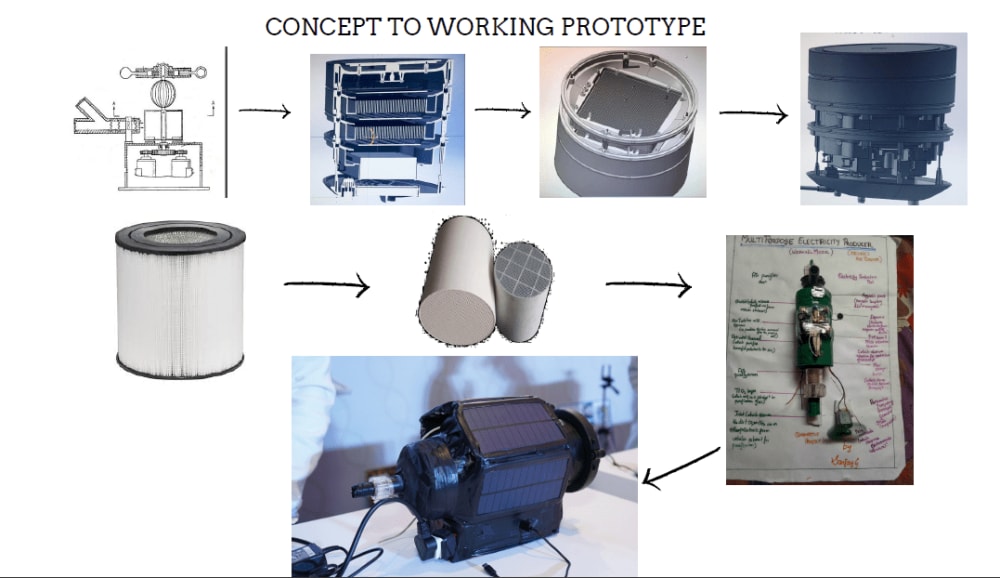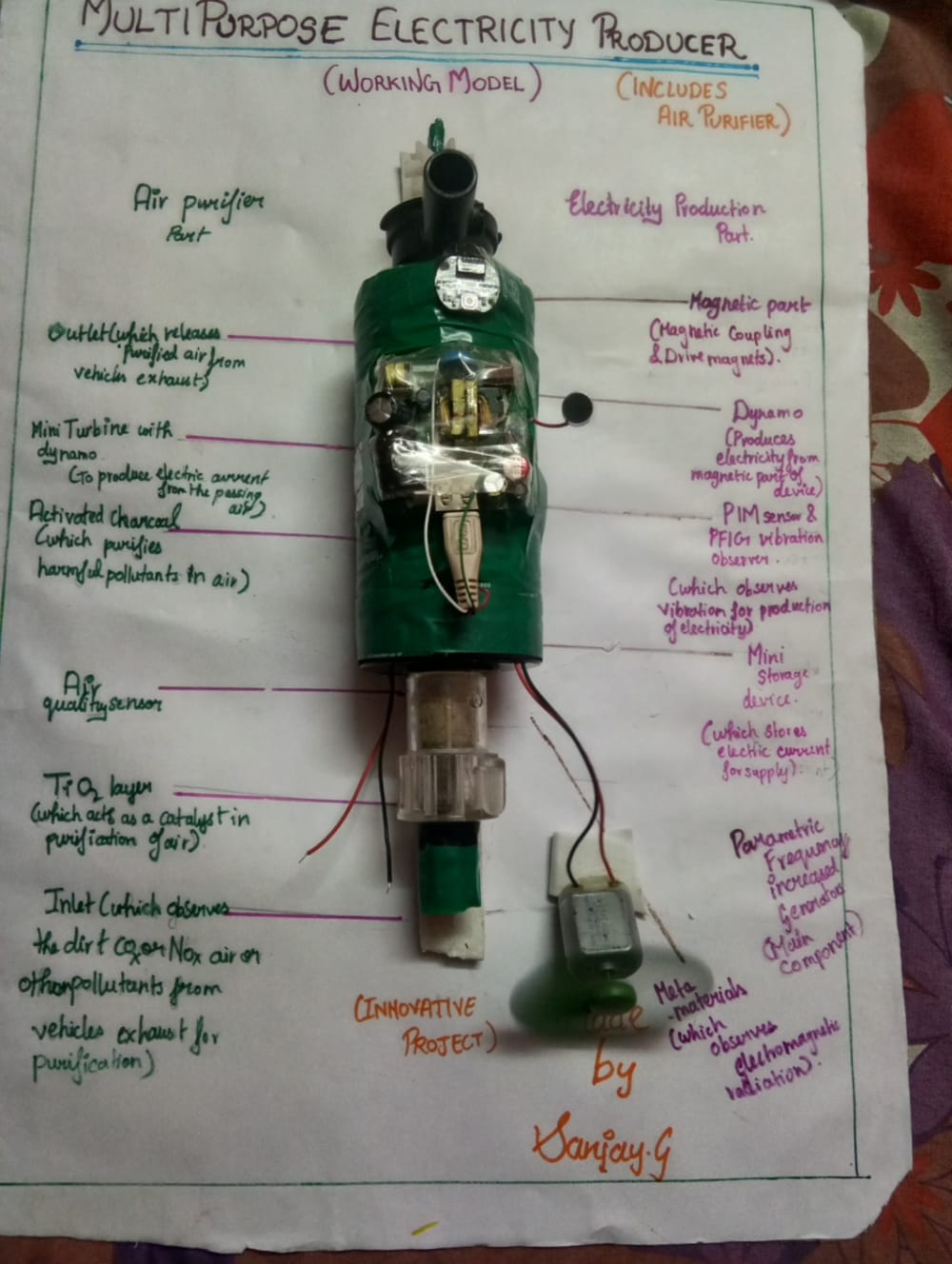 The design of MEPAP-15000 is based on the integration of various technologies such as energy-generation-storage systems, and air-filtration systems. It features CdTe and Silicon cells for solar energy, a thermal module for heat energy, EM radiation receptors for EM wave conversion, a vibration module with PZT, PFIG and turbines for wind power. This diverse array of energy sources ensures maximum energy generation. The chitosan zinc battery, made from crustacean-shells, serves as a reliable and eco-friendly power source. The air-purification system has ICC made with wash-coat technology, Silica, Alumina and Zeolite, Fe-loaded TiO2, and Orange-LED photocatalytic oxidation tech along with various filters. The device also incorporates AI and IOT. The AI algorithms analyze energy production and consumption patterns, enabling efficient distribution of power to appliances. The IoT connectivity allows users to monitor air-pollution levels and receive real-time updates on the device's performance. These components work together to capture energy from renewable sources, enables efficient power distribution and purify the air using filters and purification mechanisms.