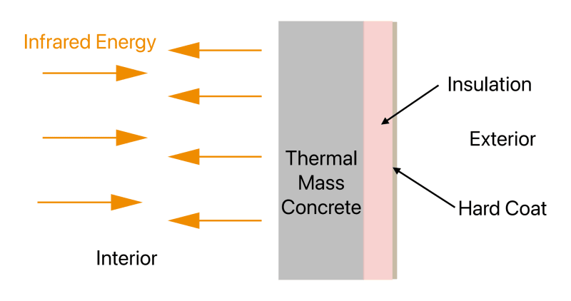 The second significant principle is that the energy contained in the thermal mass of the building only heats people and objects, and very little of the air. Nitrogen and oxygen make up 99 percent of the air and are transparent to the infrared heat energy. All of the solid objects inside the building are constantly radiating and absorbing energy. Air that is in contact with these objects is warmed slowly through conduction, and thus the temperature of the air will eventually match the temperature of the walls. Thick, rigid foam insulation on the exterior of the building significantly limits the loss of energy to the outside.