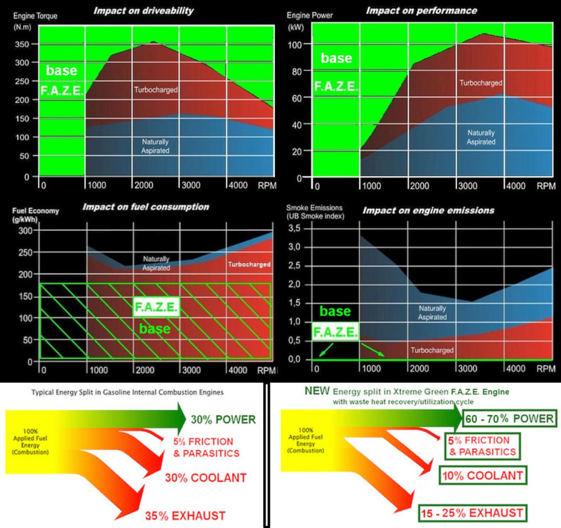 - For it's constant efficiency and torque [like an e-motor ! ], the pioneering FAZE engine/vehicle achieves a HUGE 200-500% better fuel efficiency in real world driving cycles compared to conventional vehicles. Green I.C.E. mobility....now !!!
