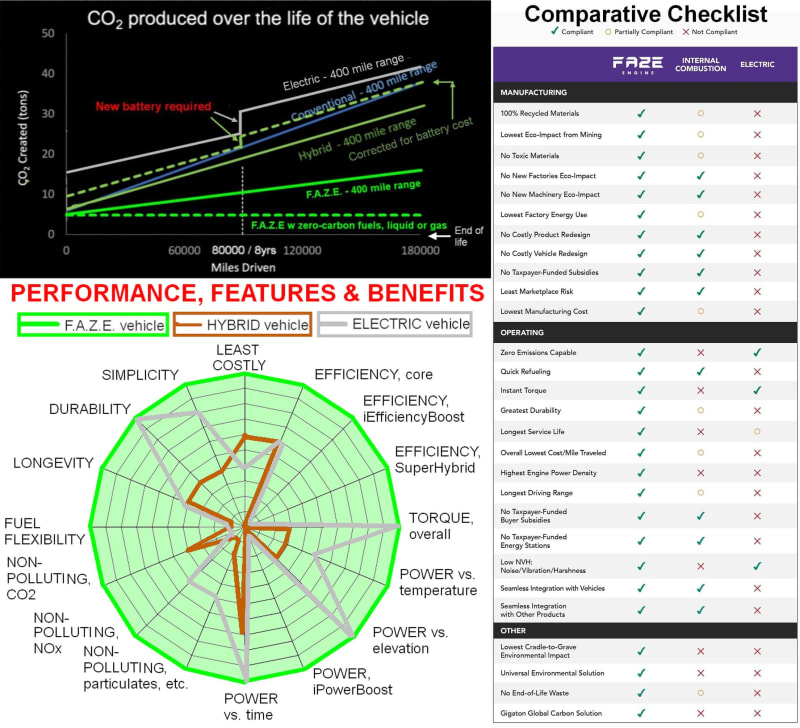 - For the foreseeable future, Internal-Combustion-Engines[ICE], hybrids and turbines will still be the inevitable go-to solutions for mobility and various power generation. Amazingly, lifetime CO2 emissions of FAZE/𝔽.𝔸.ℤ.𝔼 vehicles are half that of the vaunted EV's !!! [See graph.That's reality. EV's are not ready for prime time but this solution gives them a huge 'boost."] Ready/instant solution...now !!!