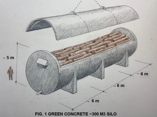 One of the possible ways trying to solve the present global temperature rising problem would be, as proposed by the Musk Foundation XPrize, a CO2 removal at an increasing rate up to attain one Gigaton/year scale by 2050, and to achieve this, to stock wood for at least hundred years into closed green concrete silos (Fig.1),