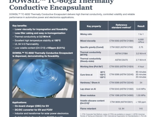 DOWSIL™ TC-6032 Thermally conductive encapsulant affects manufacturing key parts of FCEV and BEV and acceleration of new clean energy era by providing excellent process-ability and productivity improvement with higher thermal conductivity around 3.0 W/m·K and lower viscosity around 6,500 mPa·s, which is almost the lowest in similar product groups thanks to DOW’s filler combination and treating technology.
