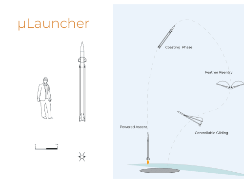 μLauncher is a small reusable suborbital vehicle. It will lift a 3U CubeSat payload at 150 km altitude and return it safely to the launch pad. It will operate at modest direct and associated per-flight costs. To achieve such an ambitious goal, μLauncher will merge innovatively proven technologies and use off-the-shelf components.
