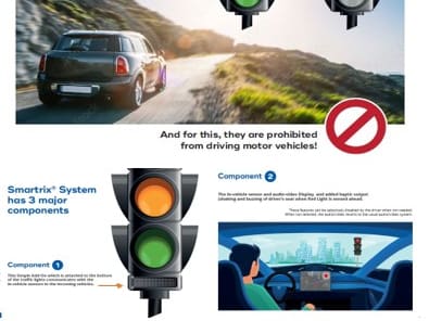 SMARTRIX® Traffic Light System in coordination with the In-Vehicle traffic light sensor- announce on the vehicle speaker and display on the monitor the color of the traffic light ahead for the color-blind drivers to hear– this enables and empowers the seriously color-blinds to “safely drive:”.
