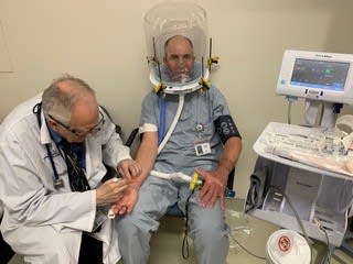 The CANADA HOOD is a compact, portable, hermetically sealed, non-invasive respiratory treatment medical device with an integrated internal Face Mask having separate gas flow and pressure adjustability from the main environmentally sealed Hood, separately protecting both the wearer, and anyone in the vicinity, from exchanging viruses and airborne pathogens,