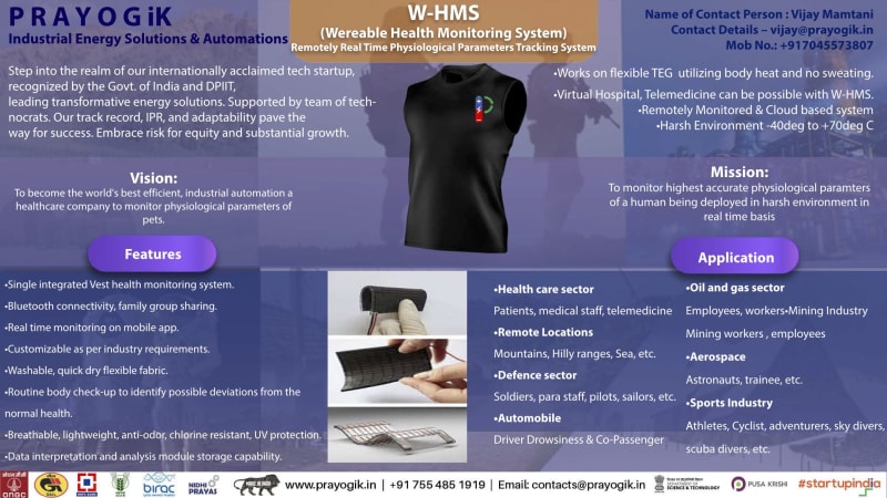 A wearable all-in-one Health Monitoring system with real time monitoring and user interface to monitor and communicate body’s vital information like ECG, Body Temperature, SPO2, Blood Pressure, etc. which is critically needed to analyse the body situation working in a harsh and rugged environment like Oil & Gas Industry, Aerospace, Security and Defence, Health and Safety.