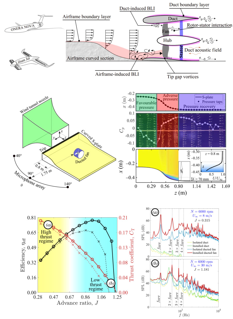 Our design study at the University of Bristol’s National Aeroacoustic Wind Tunnel Facility investigated the noise generation mechanisms of BLI ducted fans. We identified noise sources from the duct, rotating fan, and airflow over the curved airframe surface. The noise patterns vary with thrust levels: at high thrust, the noise is similar to non-ducted fans, while at low thrust, the duct significantly modifies the noise.