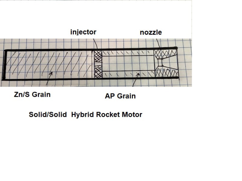 With an Isp of 175 sec with a density Isp of 1.5, it creates a rocket motor 1/2 the size of a normal solid propellant motor. Although low in Isp, this combination has a very high density Isp making it possible to reduce the size of a known total impuilse by ½. Not only is the Zn/S a combination well known in Experimental Rocketry but the combustion product is both very hot and is a fuel, ZnS vapor. This does an additioinal “burn” with the Ap in the oxidizing section.