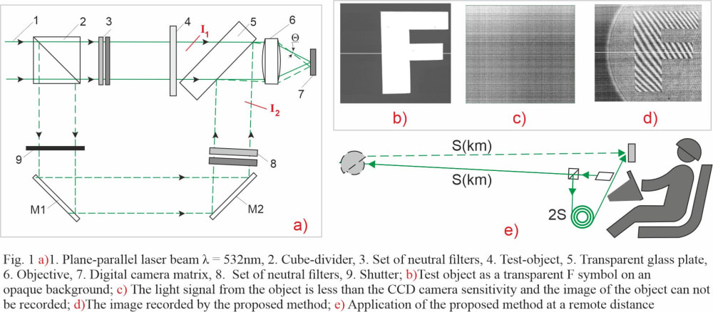 However, the coherence length of lasers usually does not exceed 50 meters. How to use this method from a remote distance (1-2 km)? The solution is depicted in Fig.1e. The laser beam is divided into two beams. The first beam passes the distance S(km) twice: to illuminate the object, and to return. The second beam is directed to a spool of optical fiber whose length is approximately 2S (km). Now, both beams have the same optical way, and coherence is maintained. The image of the object can be recorded and recognized from a remote distance using a device similar to Fig.1a. Both visible and infrared coherent laser radiation can be used.