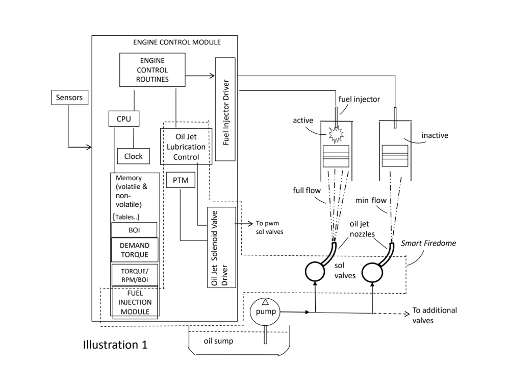 Illustration 1 satisfies these aforementioned needs by a patented (US 11, 421,565 B1) concept referred to as Smart Fire Dome and is our Next Gen Soot Reduction Concept. It senses the fuel injection “shutoff state” of each cylinder independently during deactivation and reduces the directed cooling/lubricating oil from the sump, through the oil jet piston nozzle solenoids, to the bottom side of both active and inactive pistons. Two cylinders of this engine are shown in both an active and inactive combustion state, controlled by a traditional ECM incorporating cylinder deactivation capability. Engine load requirements translate to a specific table-driven fuel-injected pulse width of injected fuel, whereby this concept mimics this pulse width and translates to a corresponding duty cycle pulse width for managing oil delivery to cool/lubricate the piston(s). The control for producing these duty cycle pulses for driving the pulse width modulating these solenoid valves is represented within the Smart Fire Dome block. Thereby, capturing all elements not incorporated in traditional cylinder deactivation strategies.