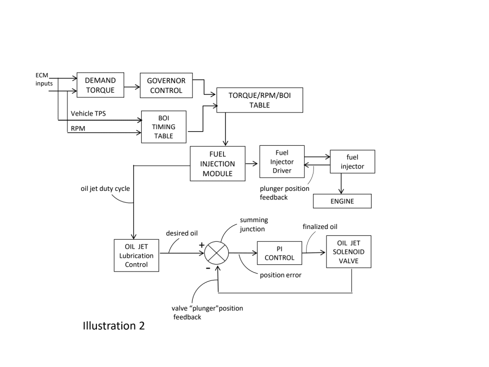 Illustration 2 depicts the closed loop control in schematic block fashion, whereby the Oil Jet Lubrication Control Block receives a continuous updated “oil jet % duty cycle value” representing fuel injection on a per cylinder basis. The desired oil feed forward value to the “summing junction” is evaluated through a set of software “lubricating/oiling rules”. A full-high-load on the piston translates to (81-100%) duty cycle, wherein a (0-20%) duty cycle represents deactivation/cutout/idle conditions. Three other middle range categories of desired oil values exist, including medium-high-load, medium-low load and low-load flow quantities. A proportional-integral control scheme with each solenoid valve preferably configured for armature or plunger position provides the needed feedback control element to the summing junction.