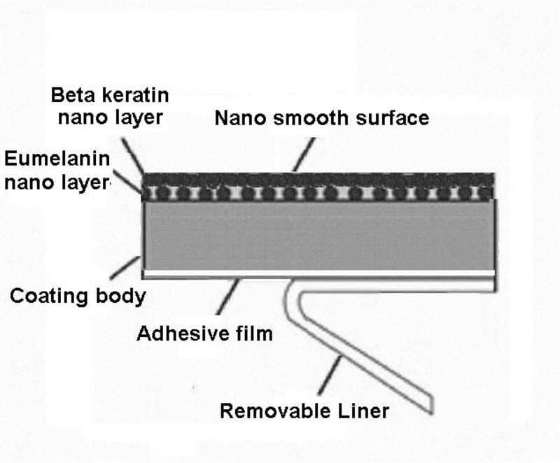 Beta keratin possessing the above quoted properties, the present proposal is then a finish consisting of a nano scale smooth external surface nano layer of beta keratin, or with a high content of it, superimposed (or not) on a nano layer containing eumelanin grains, to be applied to surfaces or surface coverings, be then smooth or textured at millimeter or micrometer scale.