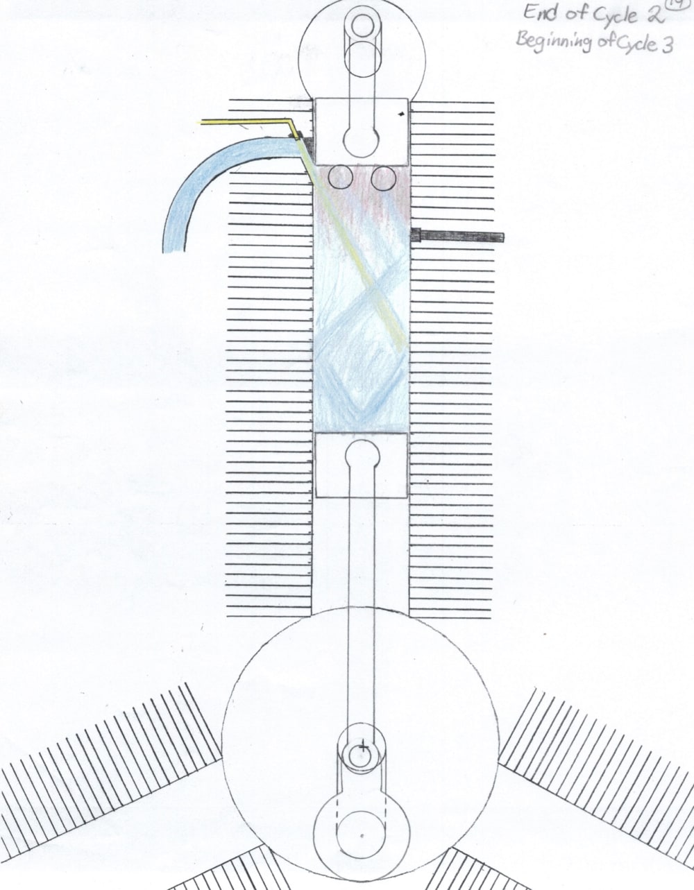 Cycle #4 The third cylinder fires, moving the first cylinder Crank Piston up 10", and the Valve Piston down 2". The crankshafts rotate one revolution, completing the Compression Stroke and all Four Cycles.