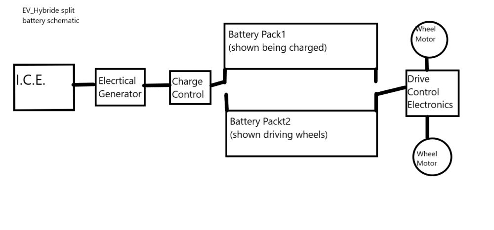 While one battery unit (1) is driving the vehicle the other is being charged by the ICE-generator and when unit(1) is discharged to a predetermined level the battery connections are switched and unit (2) is used to power the vehicle and unit (1) allowed to be charged. The cycle is then repeated by switching again.