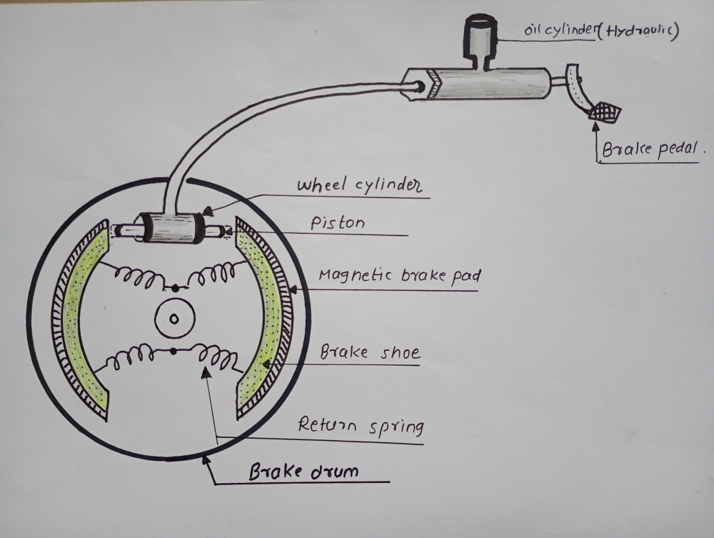 A simple arrangement of drum brake system is illustrated in the design in which semicircular magnetic brake pads are attached at the brake shoes. After application of the break these magnetic pads can stop the vehicle immediately. Magnetic brake shoes may not require regular maintenance like normal brake pads. Moreover, vehicle can stop immediately after application of breaks in case of emergency.