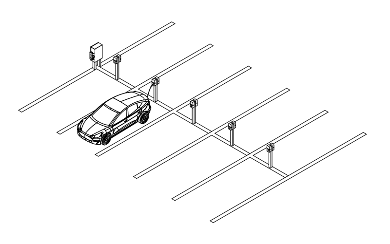 Our solution features a low-power charging hub, which reduces installation and operational costs while allowing businesses to affordably install a charging terminal in nearby parking spots. With the same cost and electrical requirements as a single level 2 charger, this charging system will charge 10 vehicles simultaneously. The charger hub does not need significant electrical infrastructure modifications, which facilitates a streamlined installation process and future expansion.