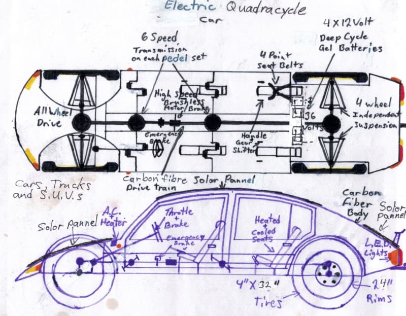 A four wheel drive vehicle with an electric motor in each wheel that drives the car. Each person has a set of pedals that are connected to a generator that charges the batteries. The outside of the vehicle is covered with see through solar panel that help charge the batteries. Two or four person cars. Two, four, or six person trucks. Four, six, or eight person S.U.V.'s.