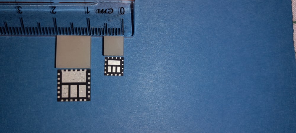 Miniaturizing a high-power 3-phase MOSFET usually sacrifices power, but I have made three 3-phase MOSFET that will not sacrifice power to miniaturize brushless motor drive application. One 3-phase MOSFET is rated for 80 amps, 40 volts and measures 10x10x1mm. Two 3-phase MOSFETs are rated for 40 and 20 amps, 30 volts and measures 6x6x0.6mm. Also in the pictures you can see a single channel MOSFET which is rated for 100 amps, 80 volts and measures 8x8x1mm...the only reason I had it made it because the TOLL package MOSFETs are larger and I wanted to see if a die used on the TOLL package could be used in a DFN8x8 package. The end result is a MOSFET with a lower resistance compared to a 80 volts TOLL package MOSFET.