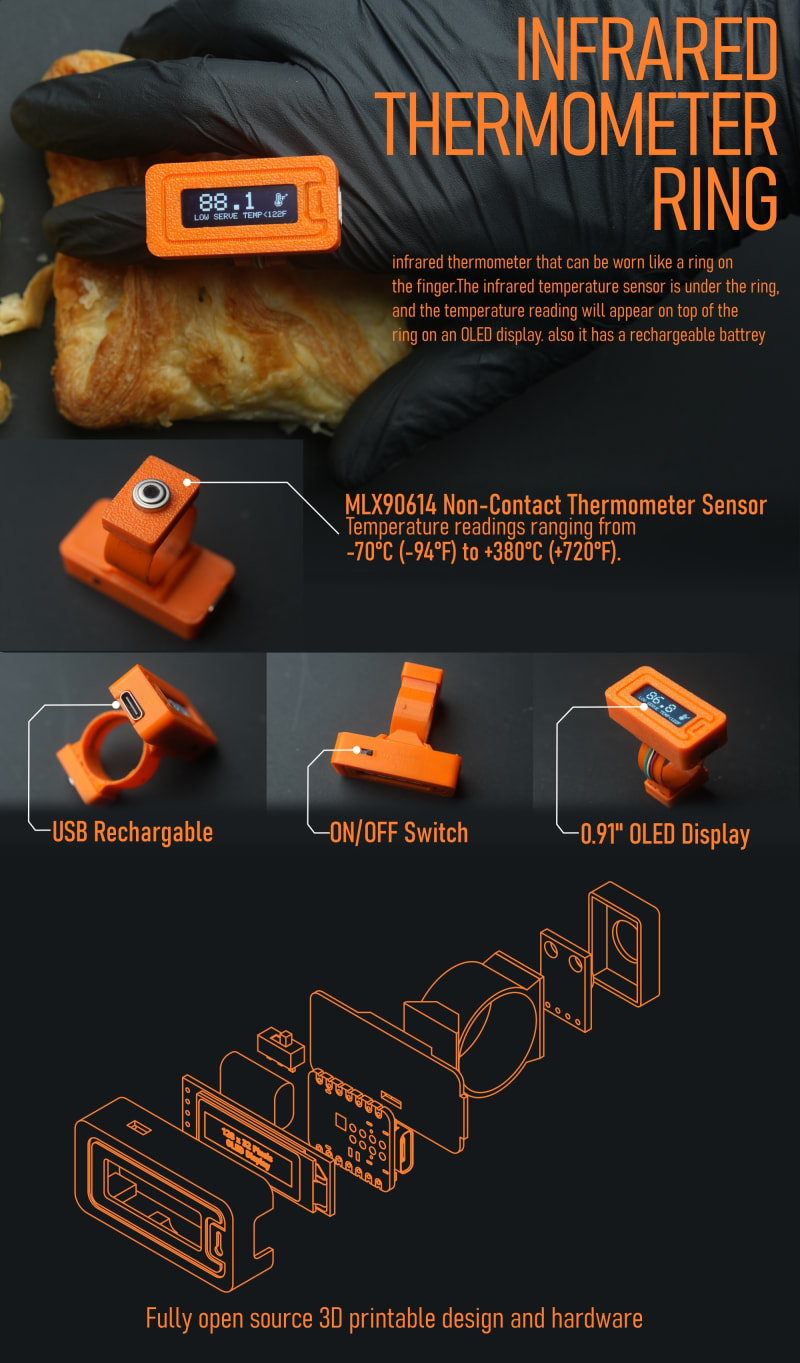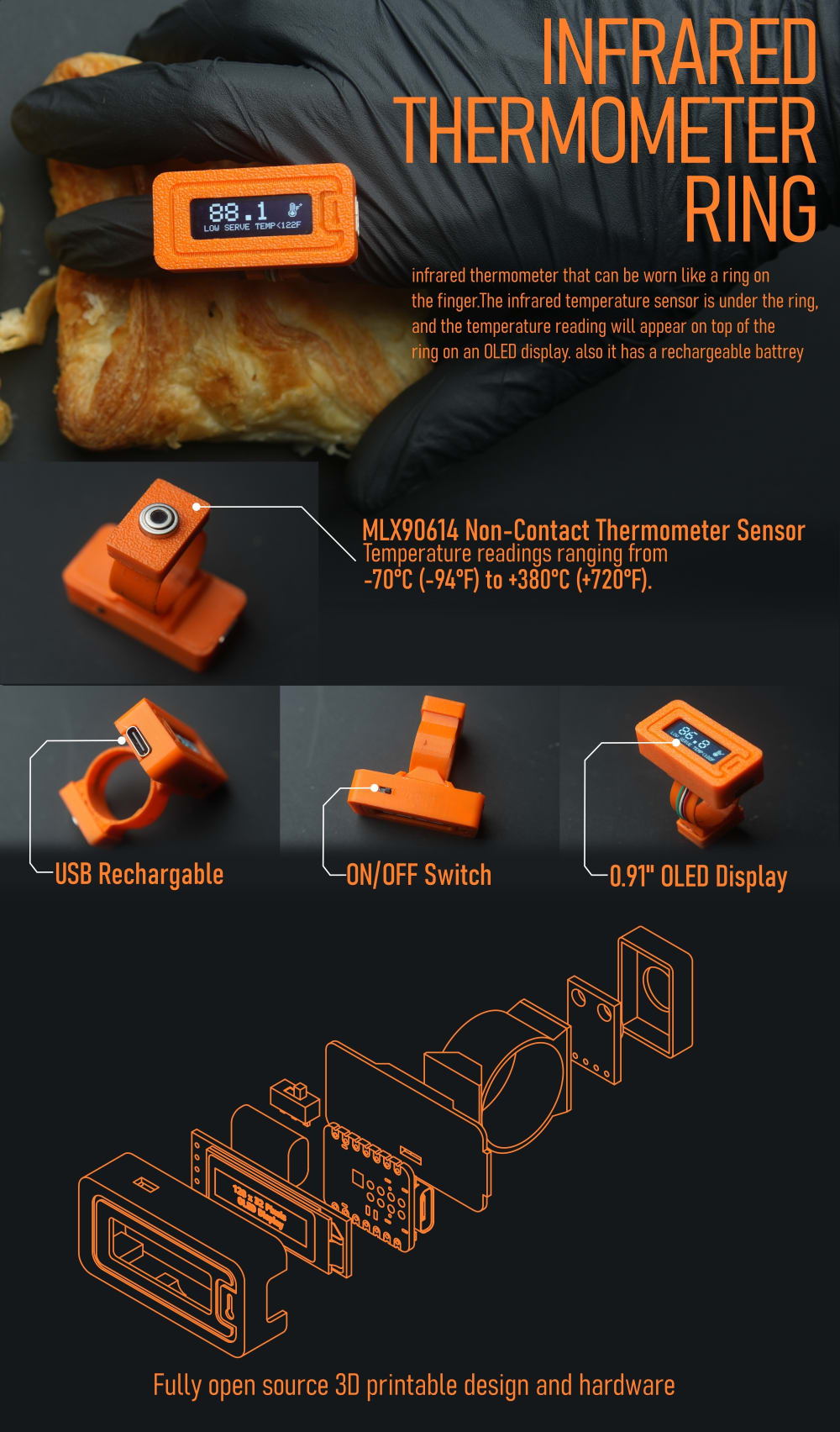 As the name suggests it is an infrared thermometer that can be worn like a ring on the finger. The thermometer has an infrared temperature sensor under the ring, and the temperature reading is displayed on an OLED screen on top of the ring. For this project, I used the Xiao esp32c3 microcontroller, and I incorporated a built-in BMS for recharging the battery. Additionally, I used the MLX90614 Non-Contact Precision Thermometer Module, which provides fast temperature readings ranging from -70°C (-94°F) to +380°C (+720°F).The sensor does not need to have contact with the subject to measure the temperature. You can get a reliable measurement from 2cm to 5cm away from the subject. this project is fully 3d printed.