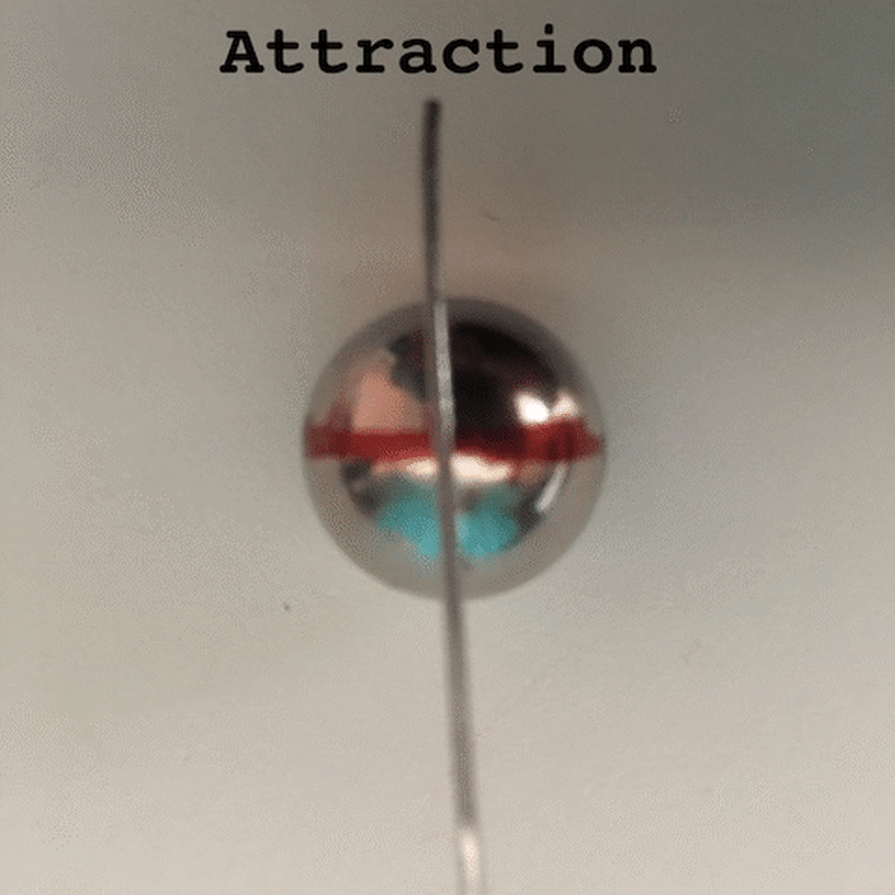 The repulsive force is best felt by an extended paperclip made of steel as a probe, approaching the N-S boundary of a spherical or hemispherical rare-earth magnet from a distance above pointing towards the centre of the rare-earth magnet, as shown in Figure 3 and Figure 4.