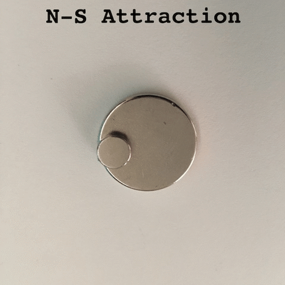 Conventional wisdom dictates that like poles repel and opposite poles attract. Thus, the S-pole of a small-diameter rod-shaped or disc-shaped permanent magnet attaches to the N-pole of a large-diameter disc-shaped permanent magnet as expected, as shown in Figure 1, albeit only to the peripheral region. However, the N-pole of a small-diameter rod-shaped or disc-shaped permanent magnet attaches to the central region of the N-pole of a large-diameter disc-shaped permanent magnet in concentric alignment, as shown in Figure 2, due to temporary magnetic-pole inversion!