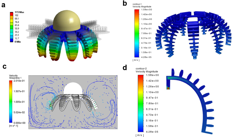 The soft robotic jellyfish is designed with manufacturability in mind. The use of readily available materials and 3D printing techniques ensures that the production process is both feasible and cost-effective. The hydraulic network actuators and submersible impellor pumps are commercially available components, simplifying the manufacturing process. The adaptive bioinspired controller, developed to maintain a predetermined depth using an onboard pressure sensor, has been demonstrated to work effectively in experimental settings. This approach ensures that the jellyfish can be produced at scale without significant increases in cost or complexity.