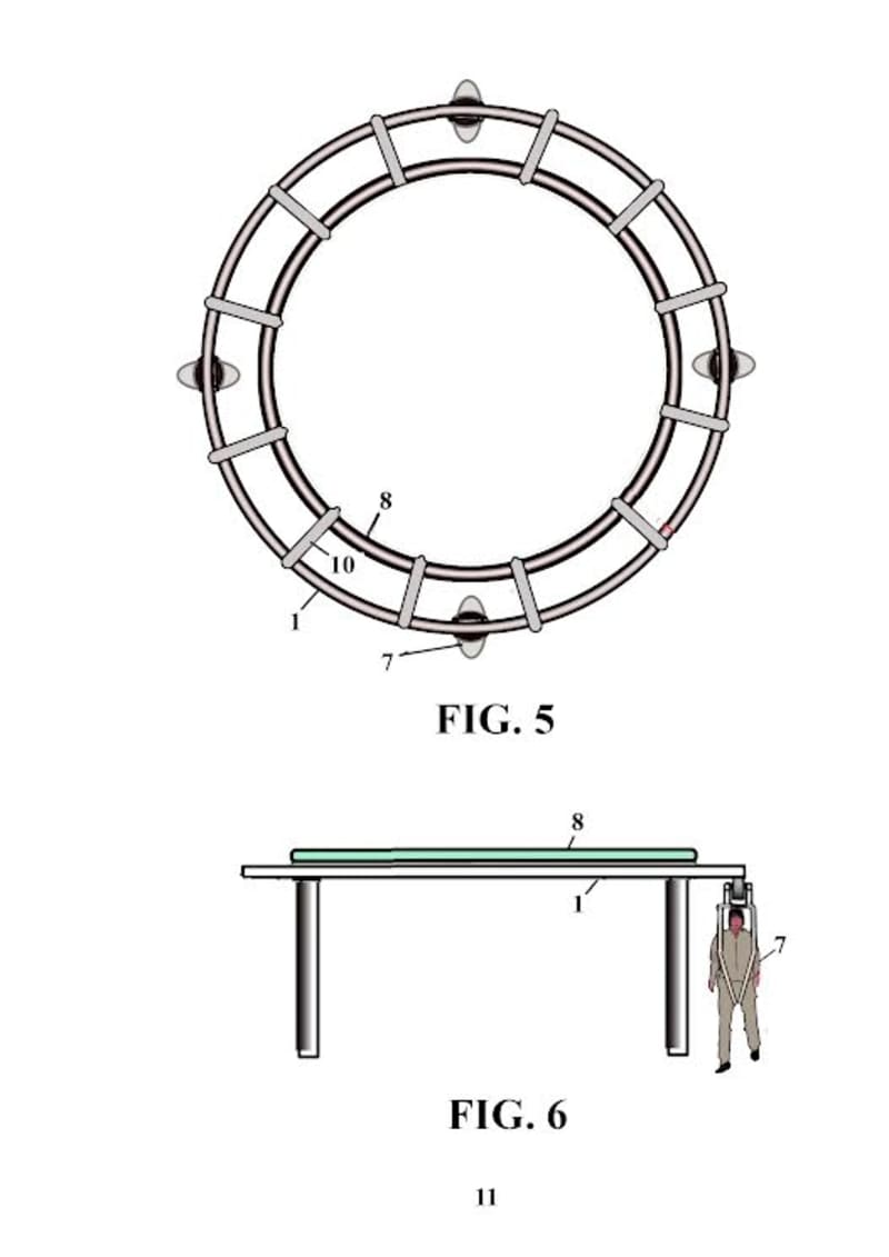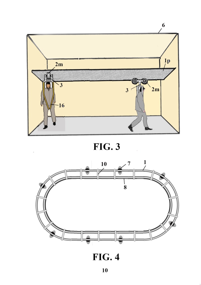- A device consisting of support elements of a harness that moves via wheels hanging from elevated tracks or rails; the harness supports the user from the armpits and/or crotch;