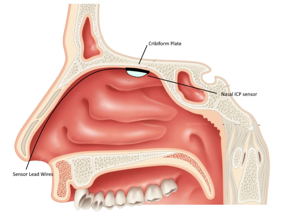 The olfactory cleft is a narrow area in the most superior part of the nasal cavity. It is comprised of three superimposed tissues: nasal mucosa, ethmoid cribriform plate, and dura mater. Evidence from humans and other mammals suggests that CSF flows through the perforations of the cribriform plate, which is a fenestrated bony plate and the structurally thinnest portion of the skull base that separates the cranial and nasal cavities. ICP fluctuations drive the wave-like pulsatile motion of CSF along the compliant spinal canal. Pulses within the CSF will be detected by slightly moving the very flexible cribriform plate into the intracranial cavity once the catheter reaches the olfactory cleft and its adjacent sensor is positioned for best contact with the olfactory epithelium. A direct reading of the ICP can be obtained through the connected pressure monitor system.