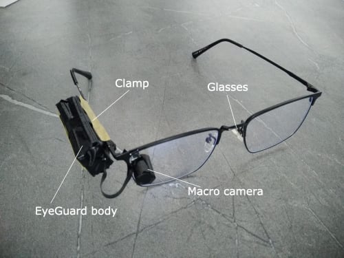 EyeGuard is a revolutionary small device designed for people with eye illnesses and those who frequently use computers. Easily installable on any pair of glasses, EyeGuard is virtually unnoticeable due to its compact size and comfortable fit.