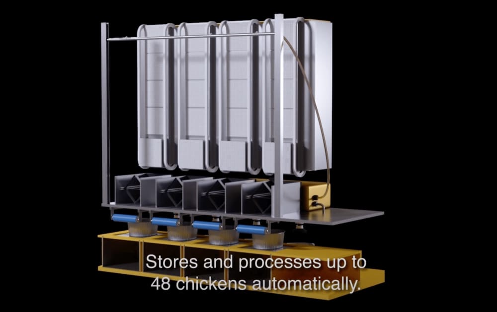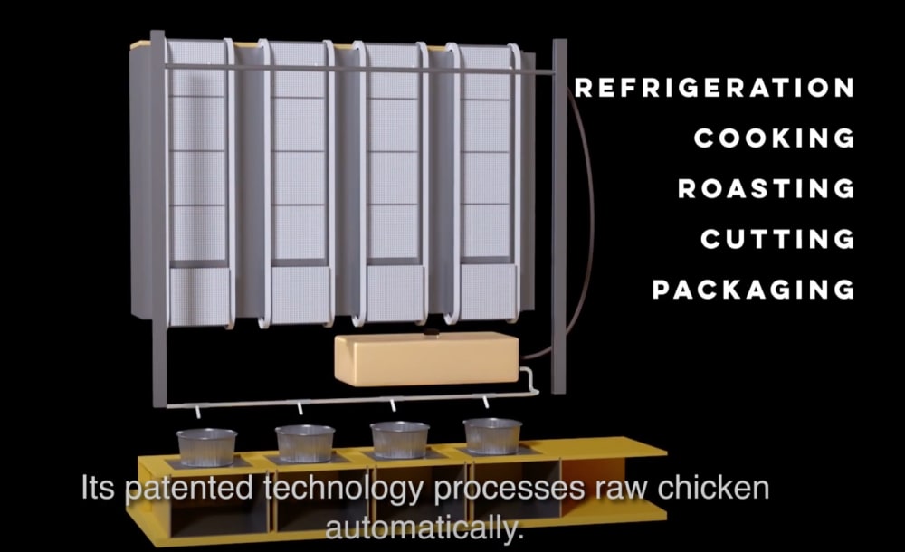 Its refrigeration, cooking, and cutting system fully automates the process of preparing, packaging, and selling roast chicken to a customer. The only interaction needed is restocking the machine. With the capacity to store up to 48 meals, Roastitnow can process chicken and similar foods.