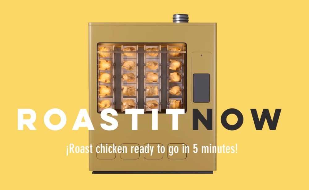Roastitnow is the first fully automated roast chicken vending machine, designed to transform raw chicken into roasted chicken, cut, and ready to eat.