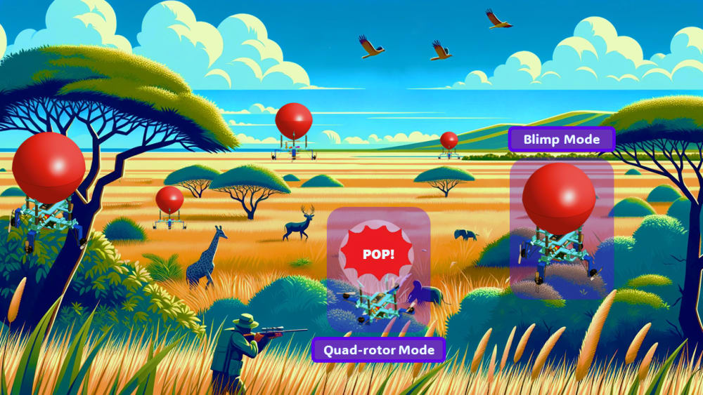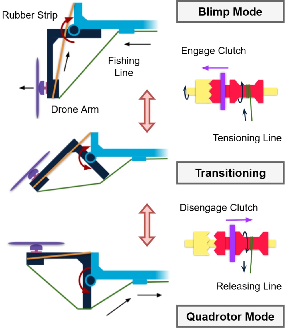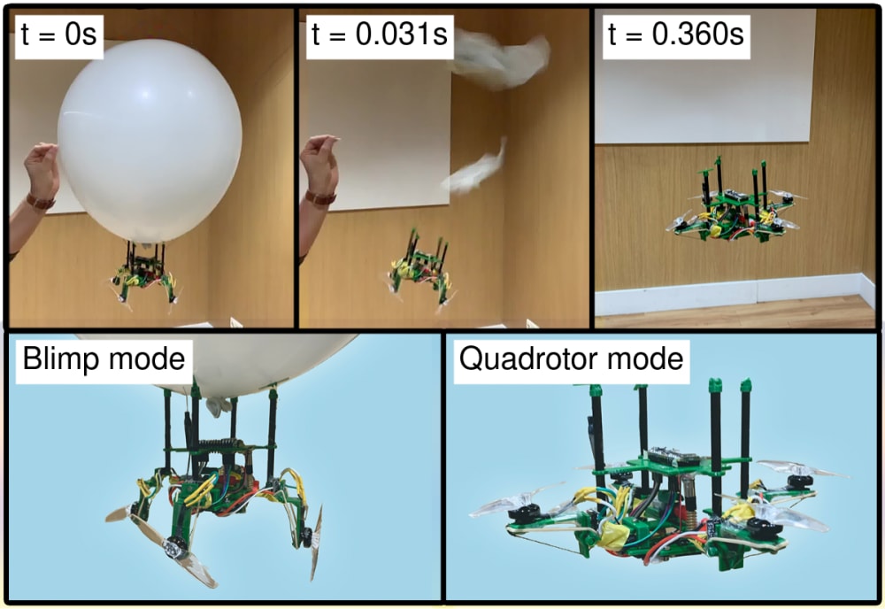 In Janus, the four rotors swivel by 90 degrees when the balloon fails, morphing the platform into a regular quadrotor drone in free fall. In unintentional or intentional balloon detachment, the platform enters free fall, providing a brief window for reaction.