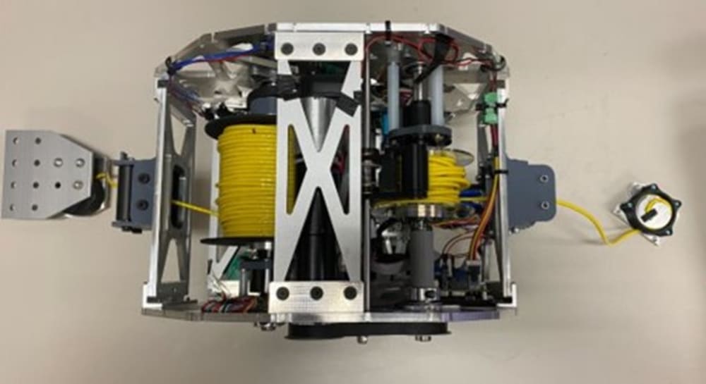 Existing, out-of-the-box quadruped robots are not made for rigorous climbing. After 5 years of intense R&D, this team developed a first-of-its-kind robot that does. One of several innovations was adding a roller arm mounted on the back of the robot. The arm pivots front-to-back, and the roller wheels extend and contract laterally to support the robot’s weight as it climbs through the manway holes from tray to tray. Cameras mounted on the robot enable perception algorithms to detect column features and to determine the robot’s relative position. The cameras also provide high resolution visual inspection data to a human operator located safely outside of the column. Given the space constraints, the robot cannot carry its own power supply, so is tethered. A tether pod holds two spools of cable and descends through the column in sync with the robot during an inspection mission. One end of the cable is attached to the top of the column, the other to the robot. The tether pod actively spools the cable and provides enough tension to prevent the robot from tripping on it.