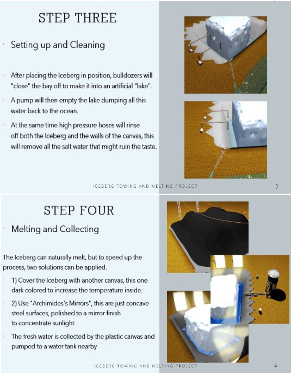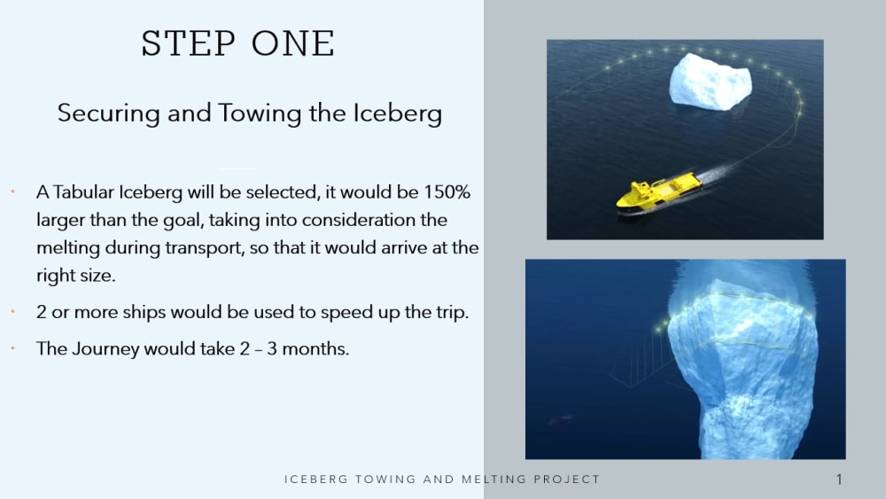 This Project explains how to tow an Iceberg from Antarctica to the Middle East, or South Africa in 3 to 4 months and at a cost of less than a Million Dollars in 4 easy Steps: