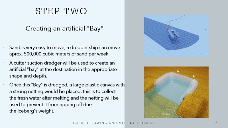 Once the area is dug out, a large plastic canvas with a strong netting will be placed, this will collect the fresh water and the netting will prevent this canvas from ripping off due to the Iceberg's weight.