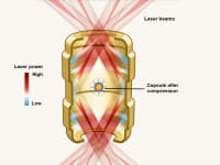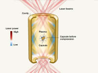 Inertial confinement fission (ICF) consists of creating a medium so dense that the particles have almost no chance of escaping without colliding with each other. To do this, a small sphere composed of deuterium and tritium is impacted by a laser beam, causing it to implode. Thus, it becomes hundreds of times denser than in its normal solid state, allowing the fusion reaction to occur.
