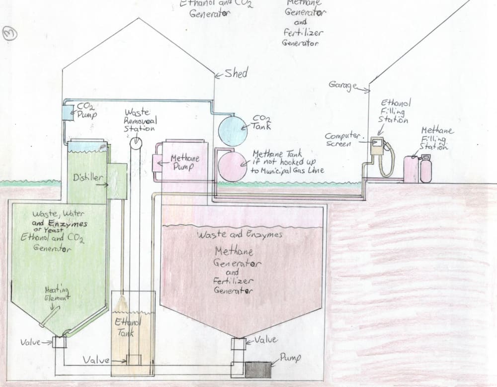 Extract oil from Corn, Soy Bean, Hemp, or anything that creates oil. The waste from that is poured into an Ethanol+CO2 Generator where it ferments. After the Ethanol+CO2 is extracted, the waste is pumped into a Methane and Fertilizer Generator where it rots. After Methane is extracted, the waste is Liquid Fertilizer.