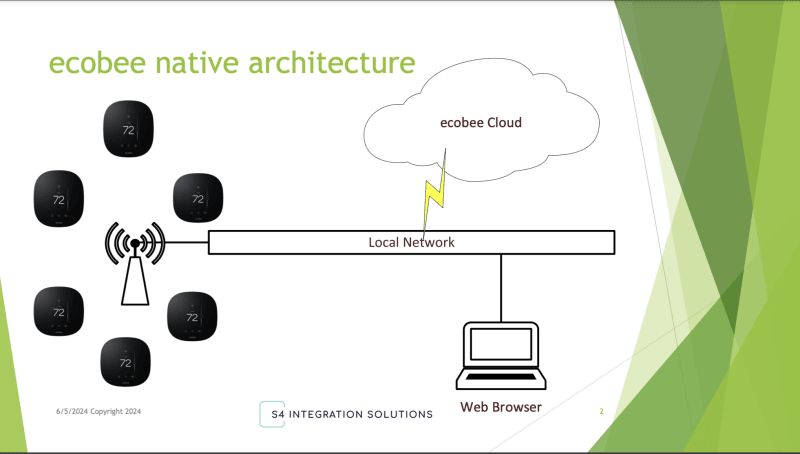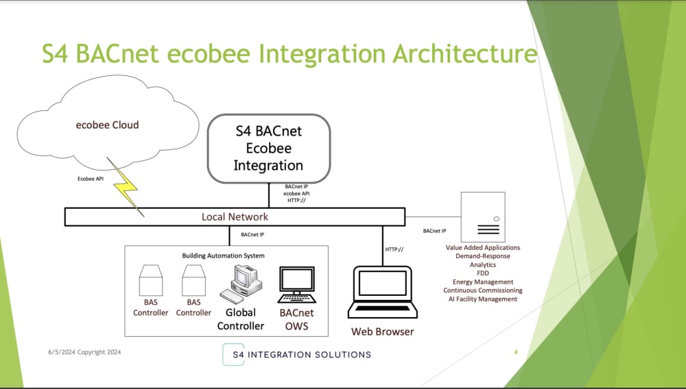 The S4 BACnet ecobee Integration enables whole building optimization by bringing ecobee Wi-Fi thermostats into the BACnet ecosystem for large, complex commercial buildings. The data from the thermostats can then be utilized by the building automation system (BAS) and any BACnet-enabled applications required to meet the building owner's requirements.