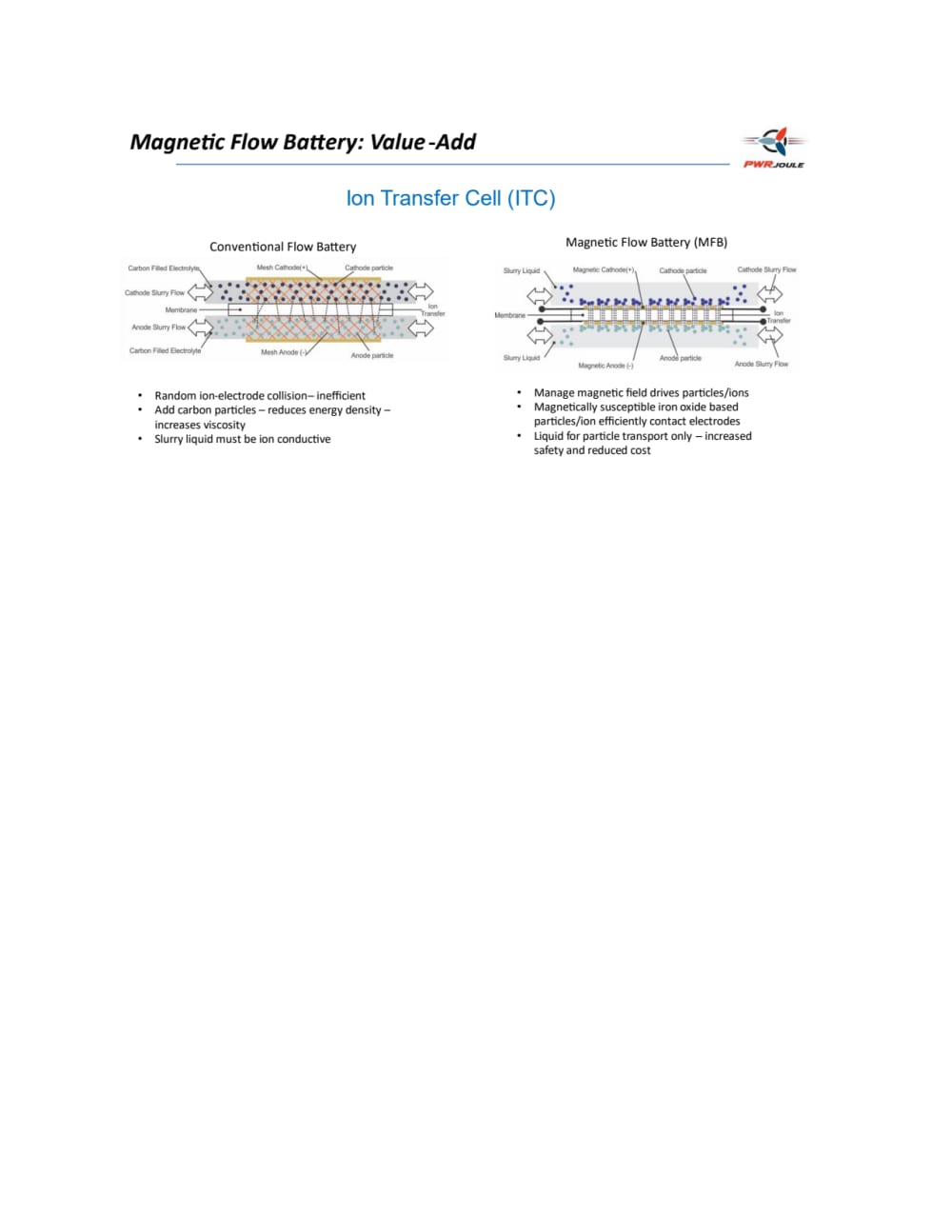 The PWRJoule business strategy is centered on the development and market introduction of Magnetic Flow Batteries (MFB) to address energy storage needs in the distributed energy resources, (DER) and transportation.