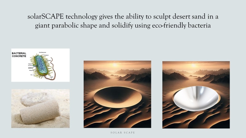 SYG TECH has developed an innovative technology that shapes desert sand into true parabolic shapes on a large scale and solidifies it using environmentally friendly biotechnology. This method allows for the collection of gigawatt-level solar energy in a cost-effective and eco-friendly manner. The technology's suitability for automation and water-free cleaning are additional advantages that make it very appealing.