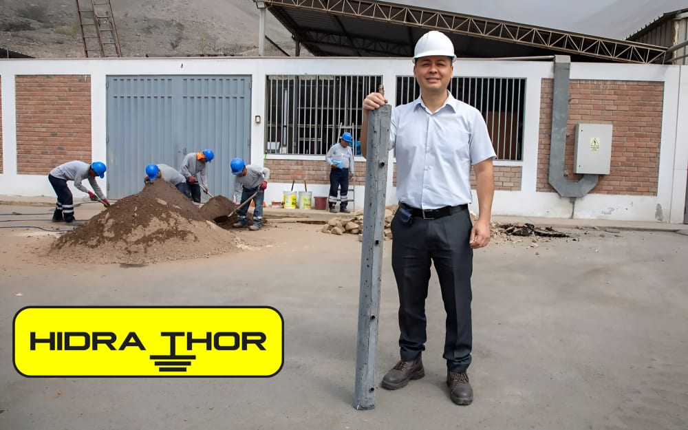 HidraThor is a grounding system whose main electrode is at the same time a rehydration system. It consists of a large diameter branched copper channel, covered with hardened conductive cement, and a ferromagnetic element located around the electrode.