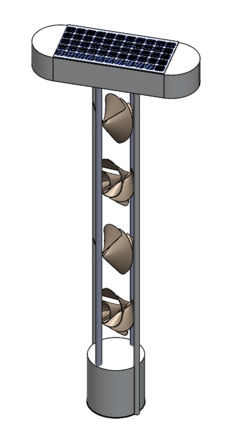 A renewable hybrid microgeneration unit is the Solar-Wind Hybrid Street Lighting System. The Solar-Wind Hybrid Street Lighting System is designed for complete integration into a system of LED street lighting. The combination of these LED street lighting systems The goal of renewable sources is to supply road infrastructure and public areas with dependable, long-lasting, and ecologically friendly lighting options. Street lights have historically been dependent on the electrical grid, which uses a lot of energy and reduces their overall sustainability and efficiency. This street light's design incorporates solar panels to collect daylight during the day on top of the lamp. Furthermore, the lamp is equipped with four turbines positioned in the middle of the road to harness the wind force generated by passing cars and organic air flows. The placement of a multiple-savonius horizontal axis wind turbine within the post's structure is the lamp's primary feature.